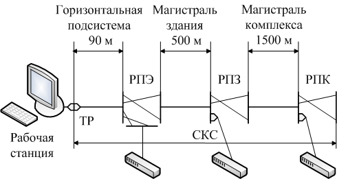 Подсистемы СКС. РПЭ - распределительный пункт этажа, РПЗ - распределительный пункт здания; РПК - распределительный пункт комплекса.