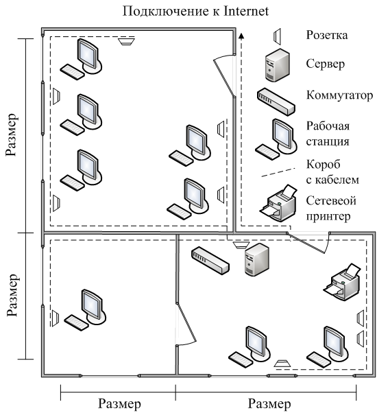 Первой и одной из главных задач является выбор правильного места размещения коммутатора и прокладка кабелей от рабочих мест. Влиять на принятие решения будет планировка помещений, положение рабочих компьютеров, личные пожелания заказчика, материал и толщина стен и т.п. В любом случае задача решаема и руководствоваться вы должны, прежде всего, здравым смыслом. Обратить внимание следует на то, что разработанный эскиз - это только общий план, и по ходу работ он будет корректироваться.