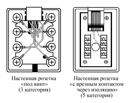 Специальные разъемы в розетках предназначены для подключения к ним концов кабеля. Сами розетки бывают двух видов: устанавливаемые на стену и устанавливаемые в короб. Модельный ряд настенных розеток представлен телефонными розетками и розетками с различным видом креплений - "под винт" и врезными контактами через изоляцию.